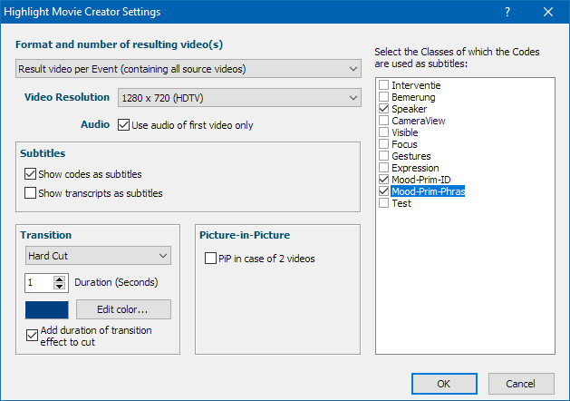 Show Codes as subtitles - Inserts the Codes logged within the selected Events, as a subtitle to the corresponding clip. The moment you activate this option, all available Classes appear in a new field at the right side of the HighLight Movie Creator settings dialog:
