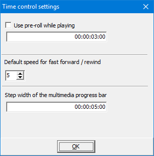 Time Control Options - Define Step width, search speed and pre-roll for individual multimedia control. |